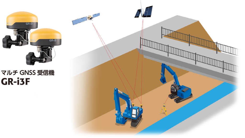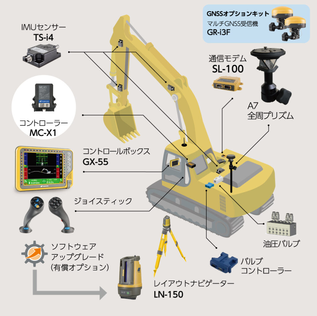 大規模現場や上空視界が開けている現場、複数のICT建機を同時に稼働させたい場合など、状況に応じGNSS仕様に換装が可能です。